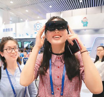 5月19日,參觀者在北京科技周上體驗國際上首款量產(chǎn)版全高清AR智能眼鏡。陳曉根攝(人民視覺)