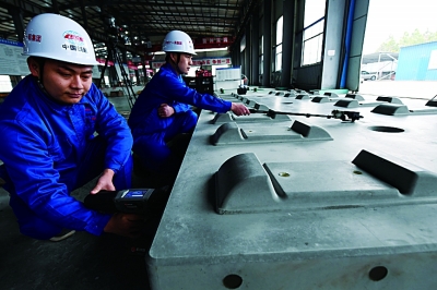 CRTSⅢ型先張法預(yù)應(yīng)力混凝土軌道板是我國(guó)自主研發(fā)、具有完全自主知識(shí)產(chǎn)權(quán)的一項(xiàng)重大科技成果。圖為工作人員給CRTSⅢ型先張法軌道板進(jìn)行激光打碼。新華社記者 宋振平攝